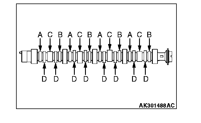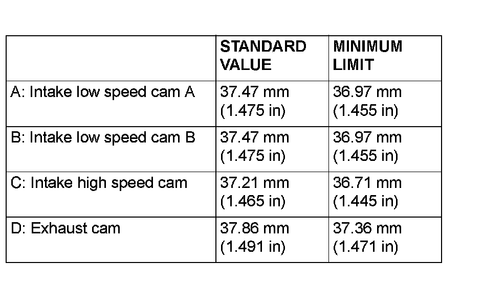 Measure the cam height. If it is below the limit, replace the camshaft.