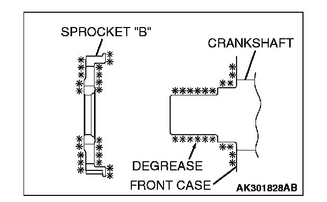 Clean and then degrease the front of the front case, crankshaft sprocket "B" and crankshaft surface on which sprocket "B" is attached.