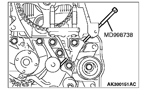 5. Set special tool MD998738 as shown and screw it in up to the position where the wire inserted in the auto-tensioner can be moved lightly.