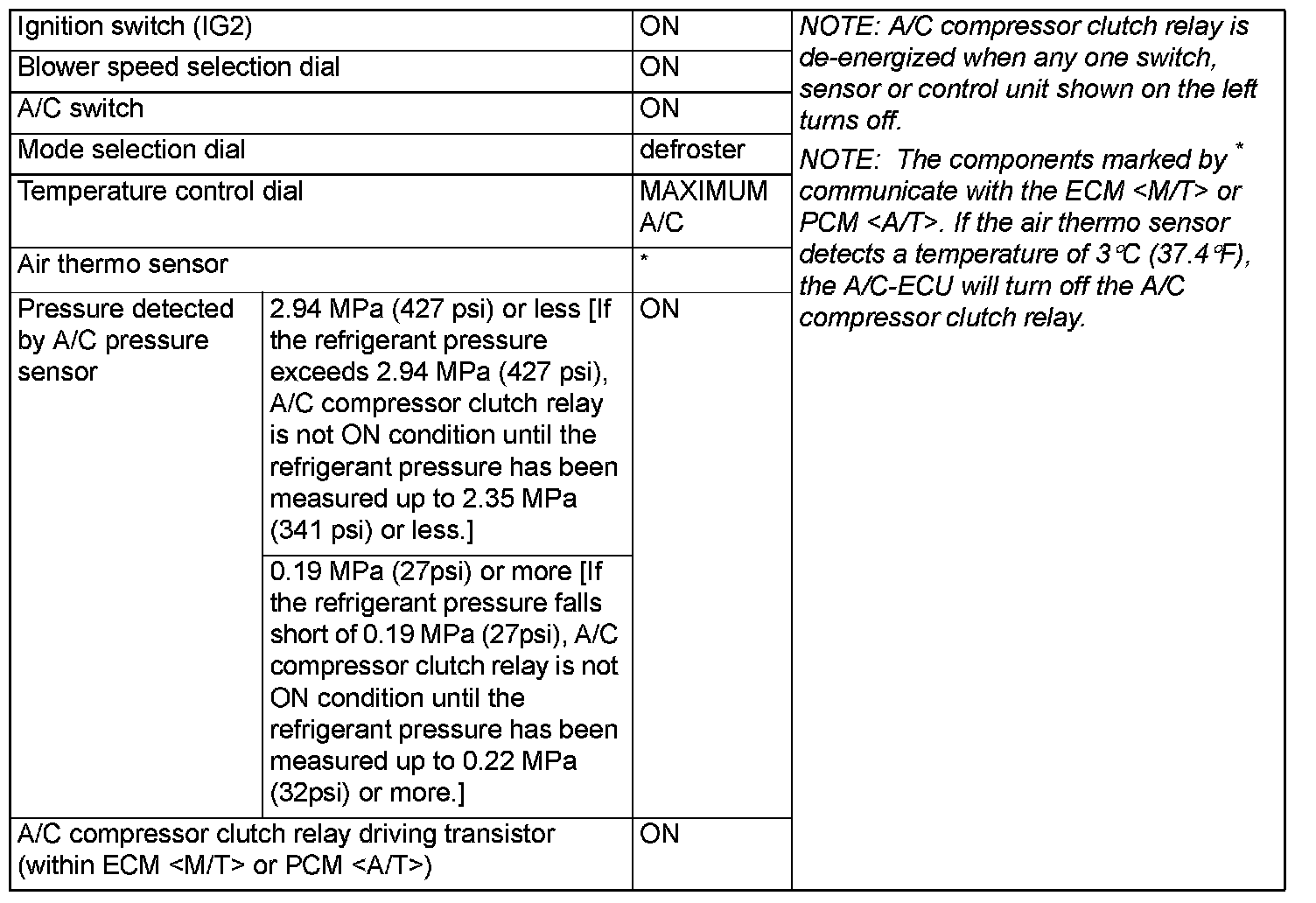 - The dual pressure switch turns OFF when the refrigerant pressure becomes excessively high or low, thus protecting the compressor circuit (See Table).