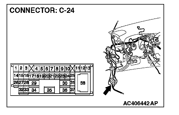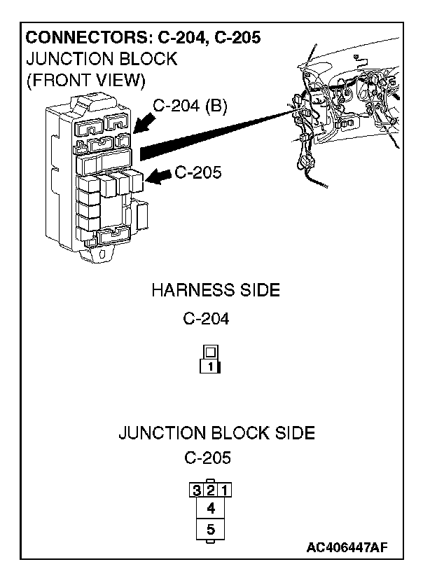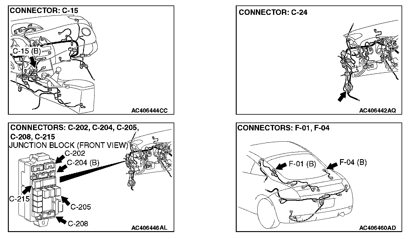 NOTE: Also check intermediate connector C-24 and junction block connector C-204 for loose, corroded, or damaged terminals, or terminals pushed back in the connector. If intermediate connector C-24 and junction block connector C-204 is damaged, repair or replace the connector as described in Harness Connector Inspection.