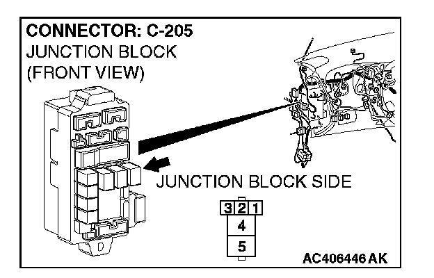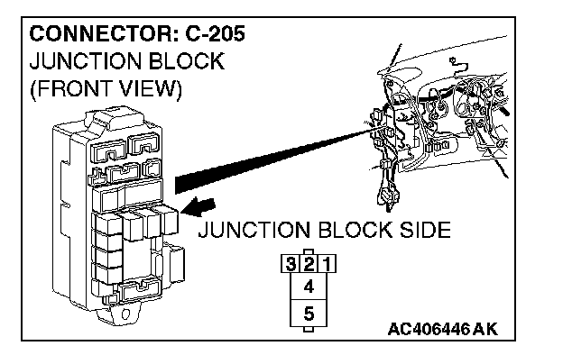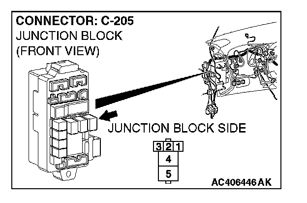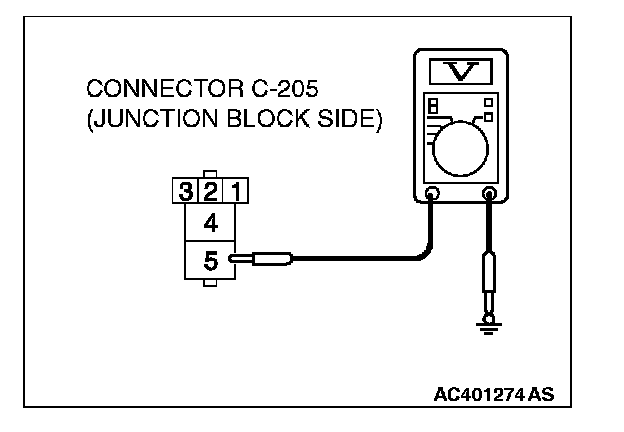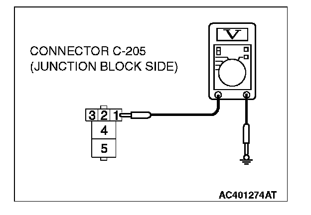 1. Disconnect rear window defogger relay connector C-205, and measure the voltage at the junction block side.