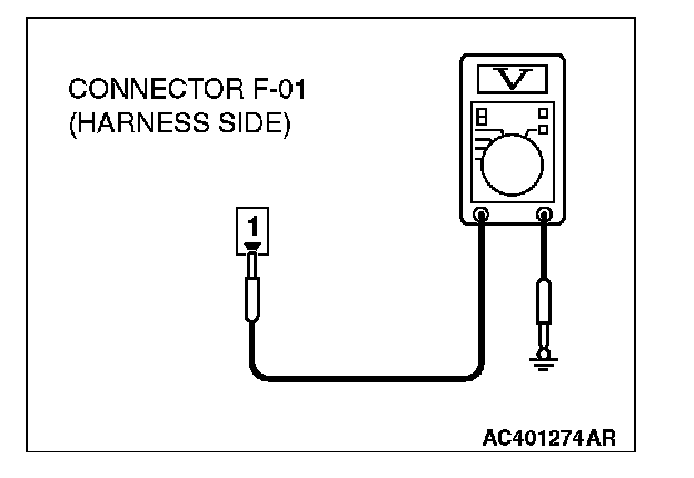 4. Measure the voltage between rear window defogger connector F-01 terminal No.1 and ground.