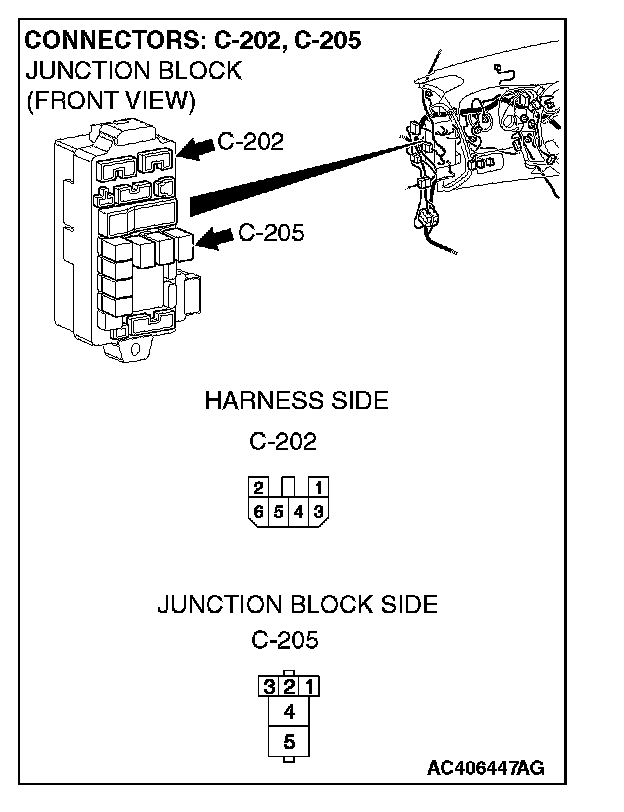 NOTE: Also check junction block connector C-202 for loose, corroded, or damaged terminals, or terminals pushed back in the connector. If junction block connector C-202 is damaged, repair or replace the connector as described in Harness Connector Inspection.