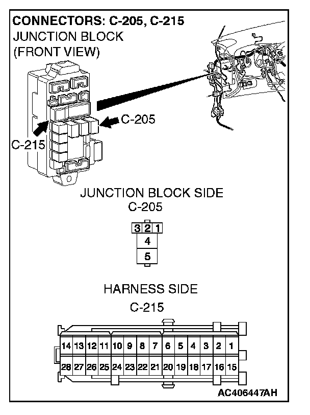 NOTE: Also check junction block connector C-215 for loose, corroded, or damaged terminals, or terminals pushed back in the connector. If junction block connector C-215 is damaged, repair or replace the connector as described in Harness Connector Inspection.
