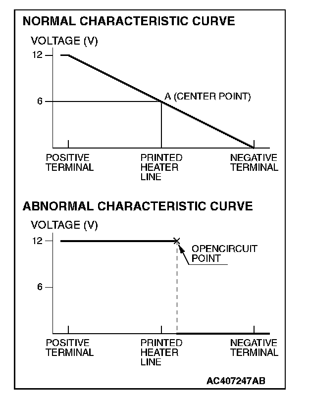 2. Turn on the rear window defogger switch, and use a voltmeter to measure the voltage in each printed heater at middle point A on the rear window glass.