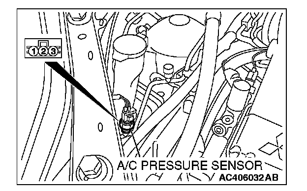 2. Disconnect the A/C pressure sensor connector and connect special tool test harness MB991658 as shown in the illustration.