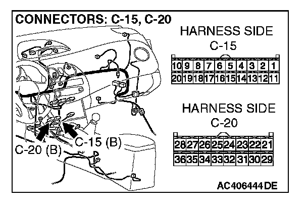 STEP 8. Check A/C-ECU connector C-15 and C-20 for loose, corroded or damaged terminals, or terminals pushed back in the connector.