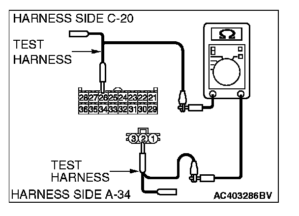 1. Disconnect A/C-ECU connector C-20 and A/C pressure sensor connector A-34, and measure the resistance at the wiring harness side.