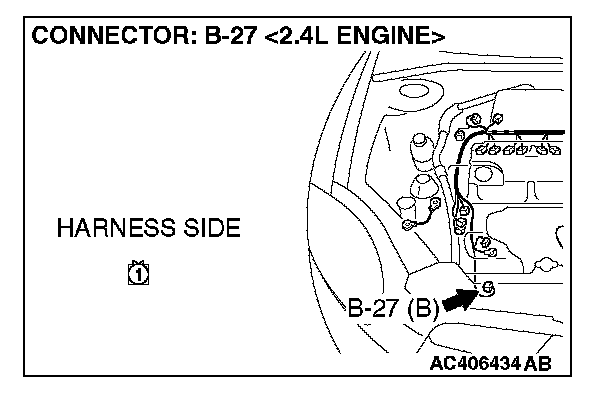 STEP 21. Check the wiring harness between A/C compressor assembly connector B-27 (terminal 1) and A/C compressor clutch relay connector B-17X (terminal 4).