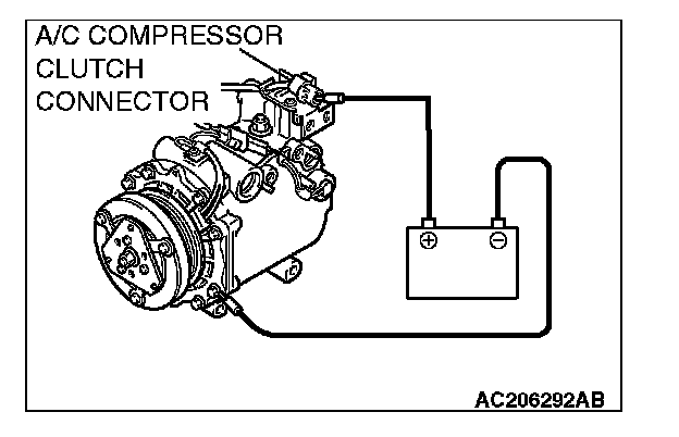 Connect the compressor connector terminal to the battery positive (+) terminal and ground the battery's negative (-) terminal to the compressor unit. At that time, the A/C compressor clutch should make a definite operating sound.
