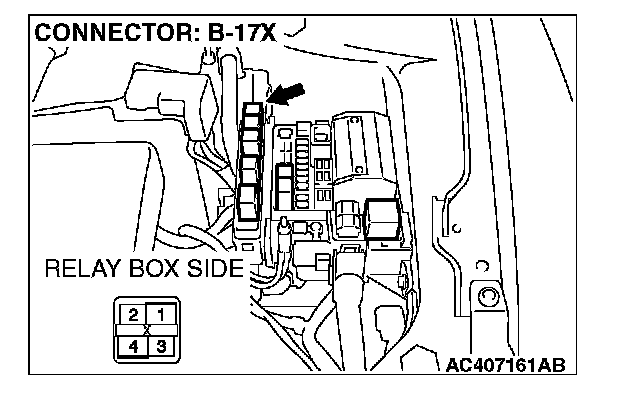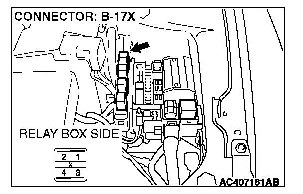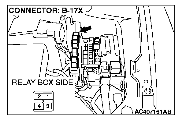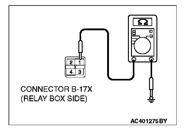 2. Measure the resistance between A/C compressor clutch relay connector B-17X terminal 1 and ground.