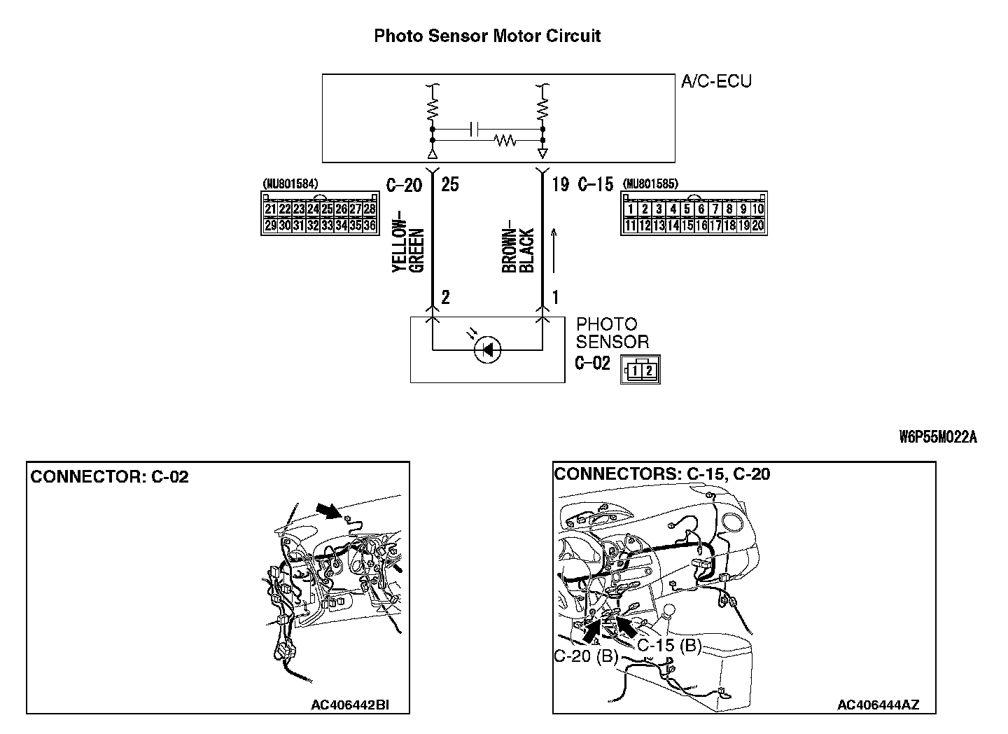 STEP 4. Check A/C-ECU connectors C-15, C-20 and photo sensor connector C-02 for loose, corroded or damaged terminals, or terminals pushed back in the connector.