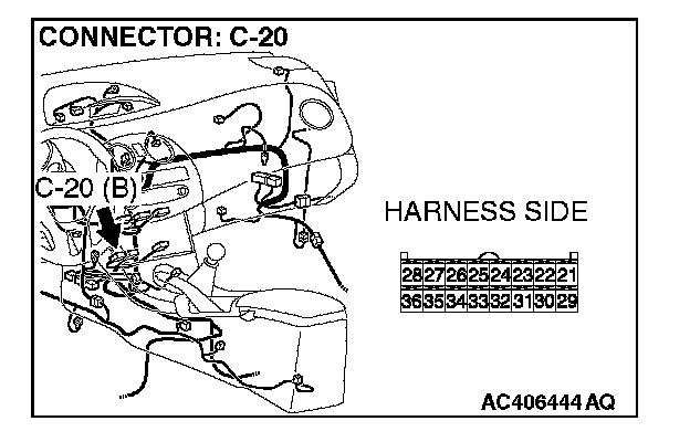 1. Disconnect A/C-ECU connector C-20 and A/C pressure sensor connector A-34, and measure the resistance at the wiring harness side.
