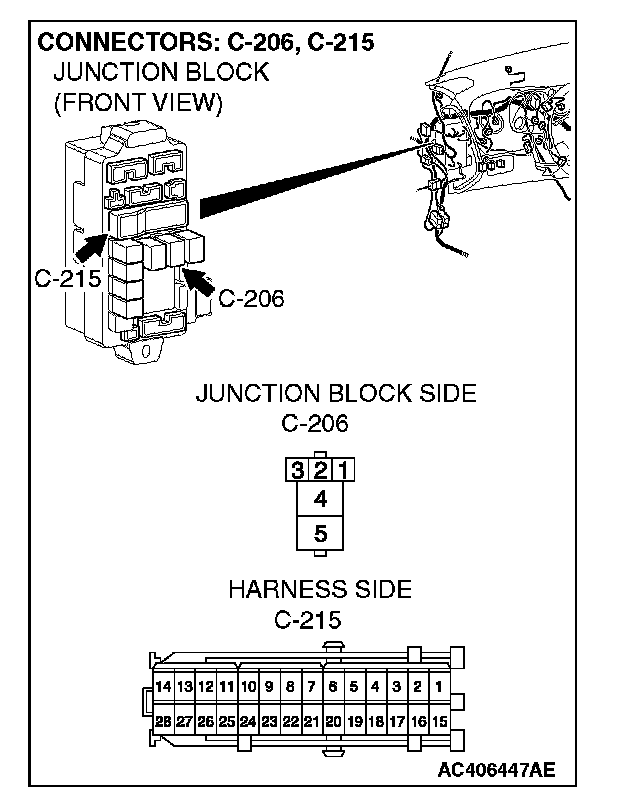 NOTE: Also check junction block connector C-215 and joint connector C-01 for loose, corroded, or damaged terminals, or terminals pushed back in the connector. If junction block connector C-215 and joint connector C-01 is damaged, repair or replace the connector as described in Harness Connector Inspection.