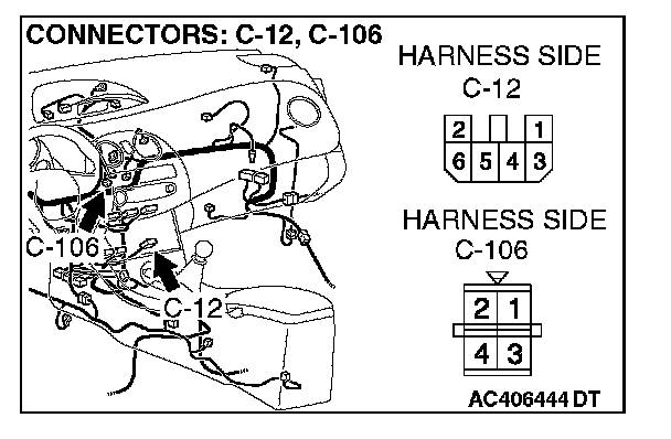 STEP 7. Check the wiring harness blower switch connector C-12 (terminals 1, 6 and 2) and resistor connector C-106 (terminals 3, 1 and 4).
