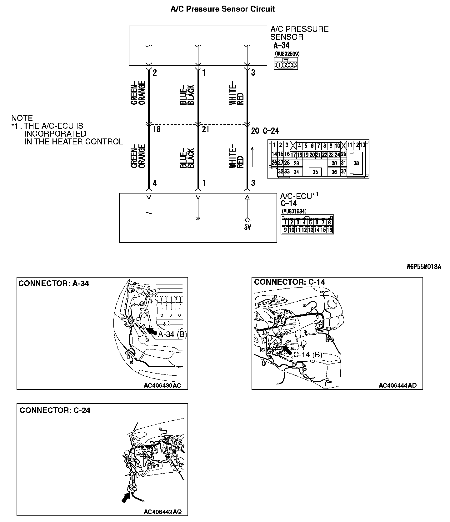 1. Disconnect A/C-ECU connector C-14 and A/C pressure sensor connector A-34, and measure the resistance at the wiring harness side.