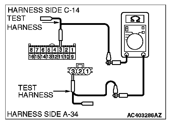 STEP 9. Check the wiring harness between A/C-ECU connector C-14 (terminal 3) and A/C pressure sensor connector A-34 (terminal 3).