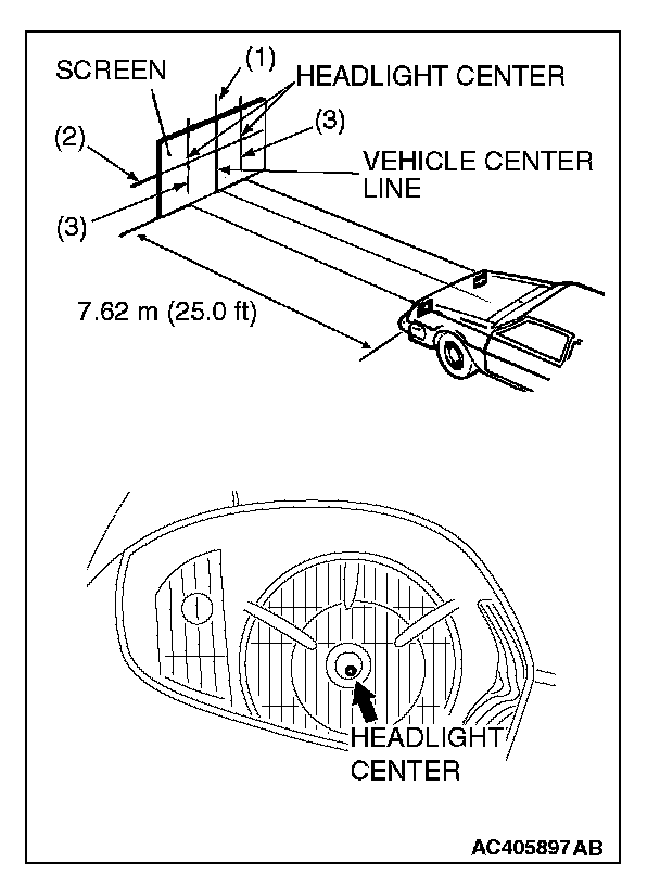 7. Place the vehicle on a level floor, perpendicular to a flat screen 7.62 m (25.0 feet) away from the bulb center-marks on the headlight lens.