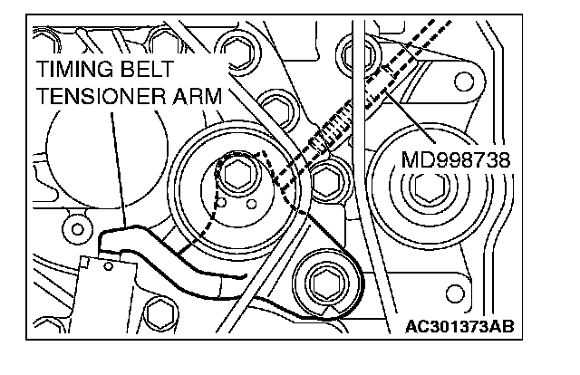 CAUTION: Special tool MD998738 must be gradually installed at a rate of 30 degrees per second. If it is screwed in all at once, the timing belt tensioner adjuster rod will not easily retract and special tool MD998738 may bend.
