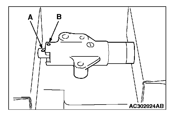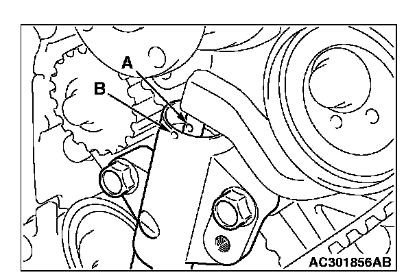 4. Gradually screw in special tool MD998738 and then align the timing belt tensioner adjuster rod set hole A with the timing belt tensioner adjuster cylinder set hole B.