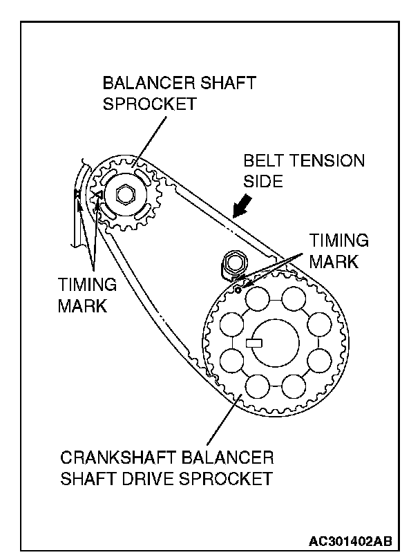 2. Install the balancer timing belt on the crankshaft balancer shaft drive sprocket and balancer shaft sprocket. There should be no slack on the tension side.