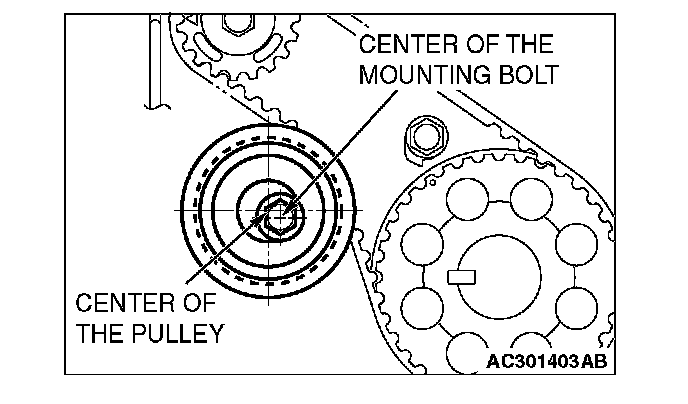 CAUTION: When tightening the mounting bolt, ensure that the timing belt tensioner pulley does not rotate with the bolt. Allowing it to rotate with the bolt can cause deficient tension of the belt.