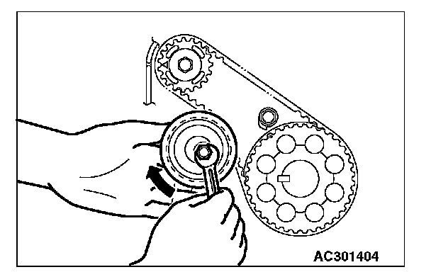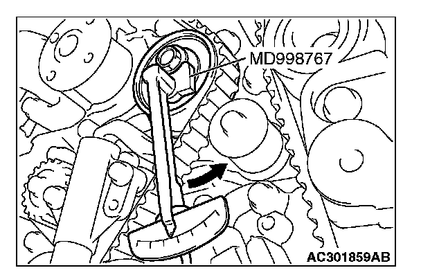4. Turn the timing belt tensioner pulley in the direction shown in the figure using special tool MD998767 to apply tension to the valve timing belt. Then temporarily tighten and fix the timing belt tensioner pulley mounting bolt.