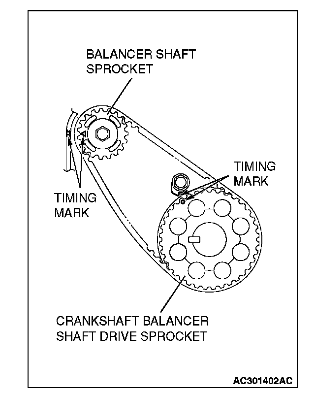 1. Ensure that the crankshaft balancer shaft drive sprocket timing marks and balancer shaft sprocket timing marks are aligned.