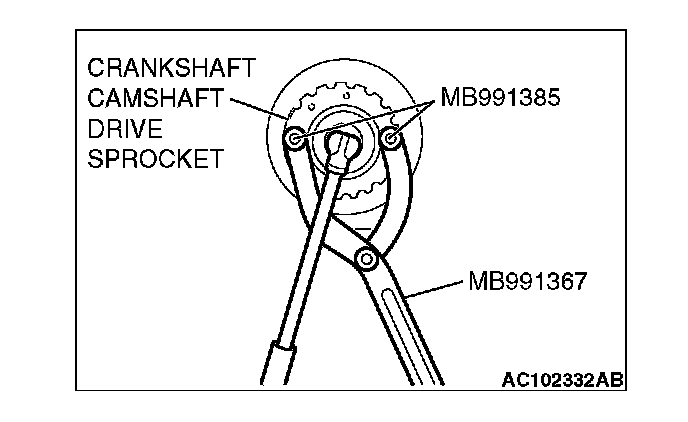 1. Hold the crankshaft camshaft drive sprocket with special tools MB991367 and M13991385.