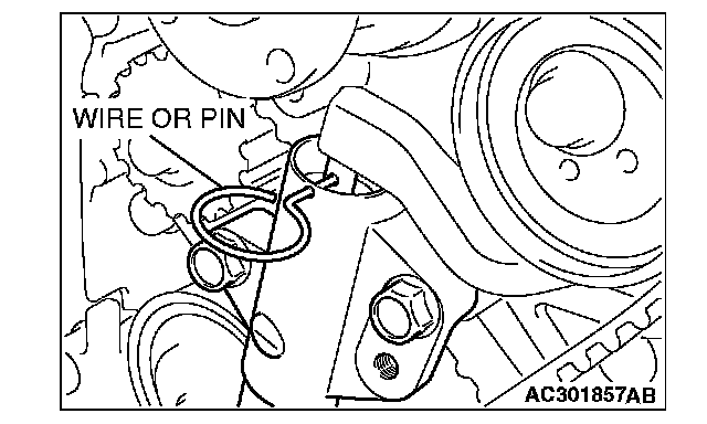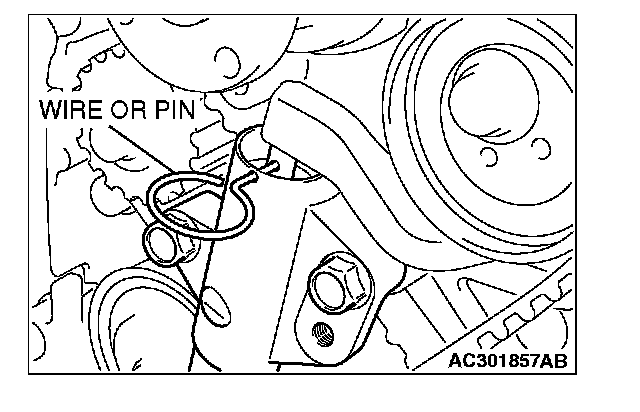 10. Insert the wire or pin removed in Step 7 again, and ensure that it can be pulled out easily. When the wire or pin can be easily removed, appropriate tension is applied on timing belt. In this case, remove wire or pin.