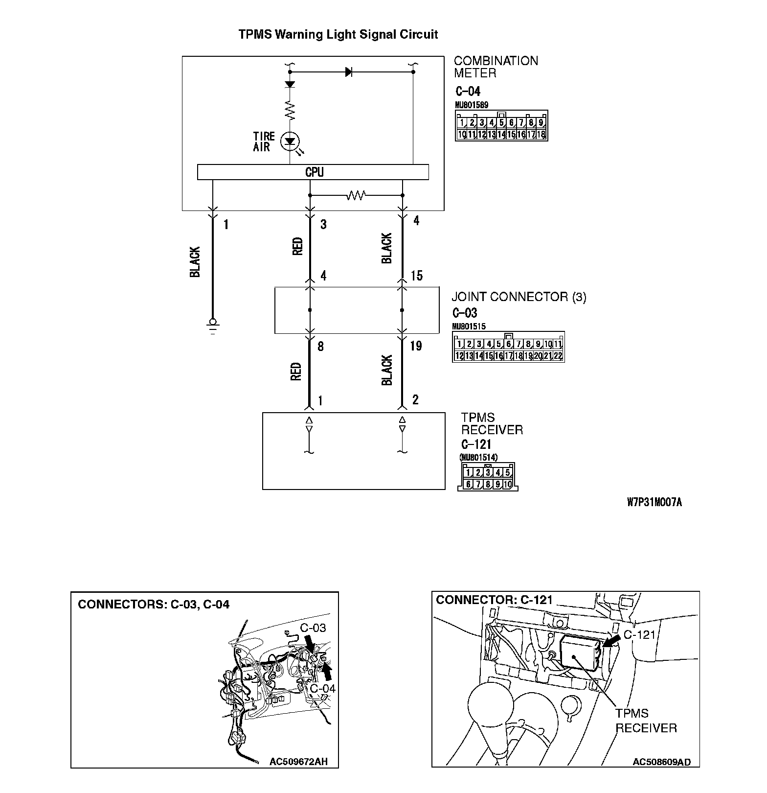 INSPECTION PROCEDURE 1: The TPMS Warning Light Stays On.TPMS Warning Light Signal Circuit Connectors: C-03, C-04, C-121: