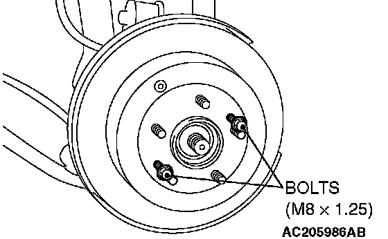 If the brake disc is seized, install M8 x 1.25 bolts as shown, and remove the disc by tightening the bolts evenly and gradually.