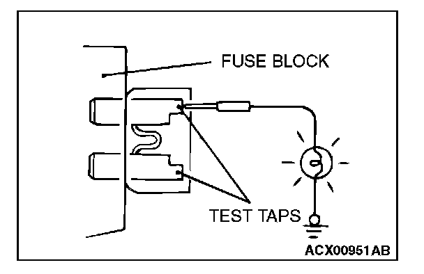 A blade type fuse has test taps provided to allow checking of the fuse itself without removing it from the fuse block. The fuse is okay if the test light comes on when its one lead is connected to the test taps (one at a time) and the other lead is grounded. Remember to turn the ignition switch to ON to ensure all circuits are live.