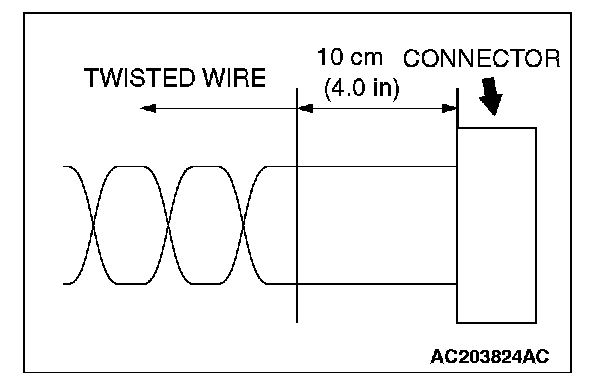 - If the connector or wire on the main bus line or the sub-bus wire is replaced, the strand end of the twisted wire should be within 10 cm (4.0 inches) from the connector. If it exceeds 10 cm (4 inches), twist the wiring harness just like the original twisted wire. If the strand end exceeds 10 cm (4 inches), noise suppression is deteriorated, causing a communication error.