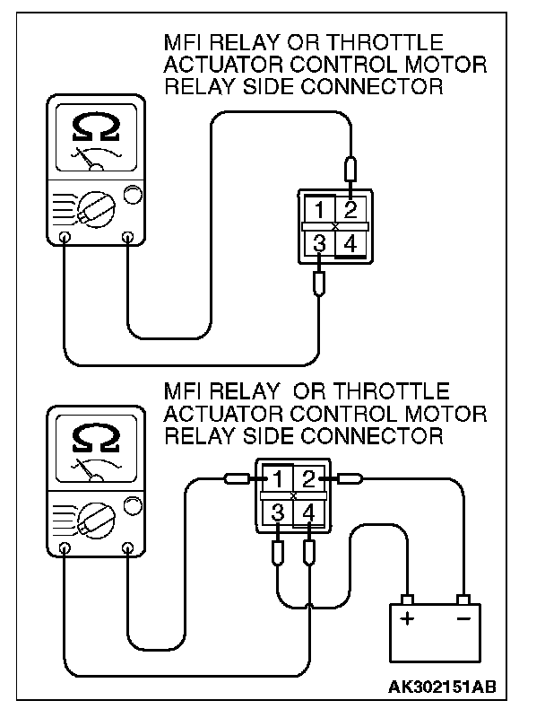 MULTIPORT FUEL INJECTION (MFI) RELAY AND THROTTLE ACTUATOR CONTROL MOTOR RELAY CONTINUITY CHECKInspect the MFI relay and throttle actuator control motor relay for continuity in accordance with the chart shown.