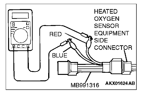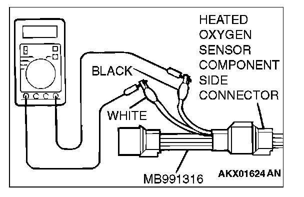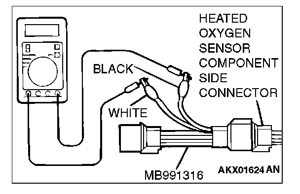 1. Disconnect the heated oxygen sensor connector and connect special tool MB991316 to the connector on the heated oxygen sensor side.