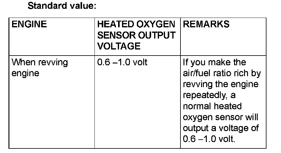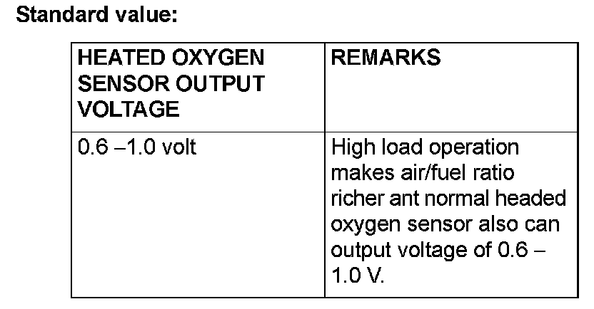 NOTE: If the sufficiently high temperature [of approximate 400 °C (752 °F) or more] is not reached although the heated oxygen sensor is normal, the output voltage would be possibly low although the rich air/fuel ratio.