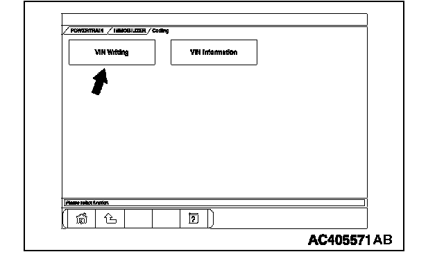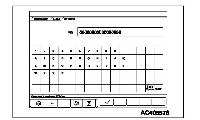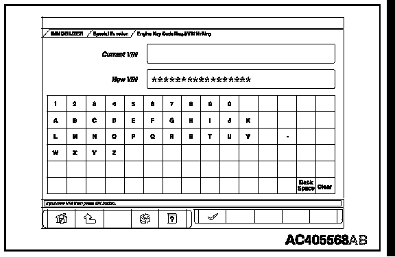 HOW TO PERFORM VEHICLE IDENTIFICATION NUMBER (VIN) WRITINGThe Vehicle Identification Number (VIN) is stored in the ECM or PCM by the vehicle manufacture. If the VIN to be stored in the ECM or PCM is eliminated fraudulently, the Malfunction Indicator Lamp (SERVICE ENGINE SOON or Check Engine Lamp) illuminates and Diagnostic Trouble Code (DTC) No. P0630 (VI N malfunction) is shown. When the ECM or PCM is replaced, and entry of the VIN necessary due to DTC No. P0630 (VIN malfunction). Enter the VIN in accordance with the procedure as follows: