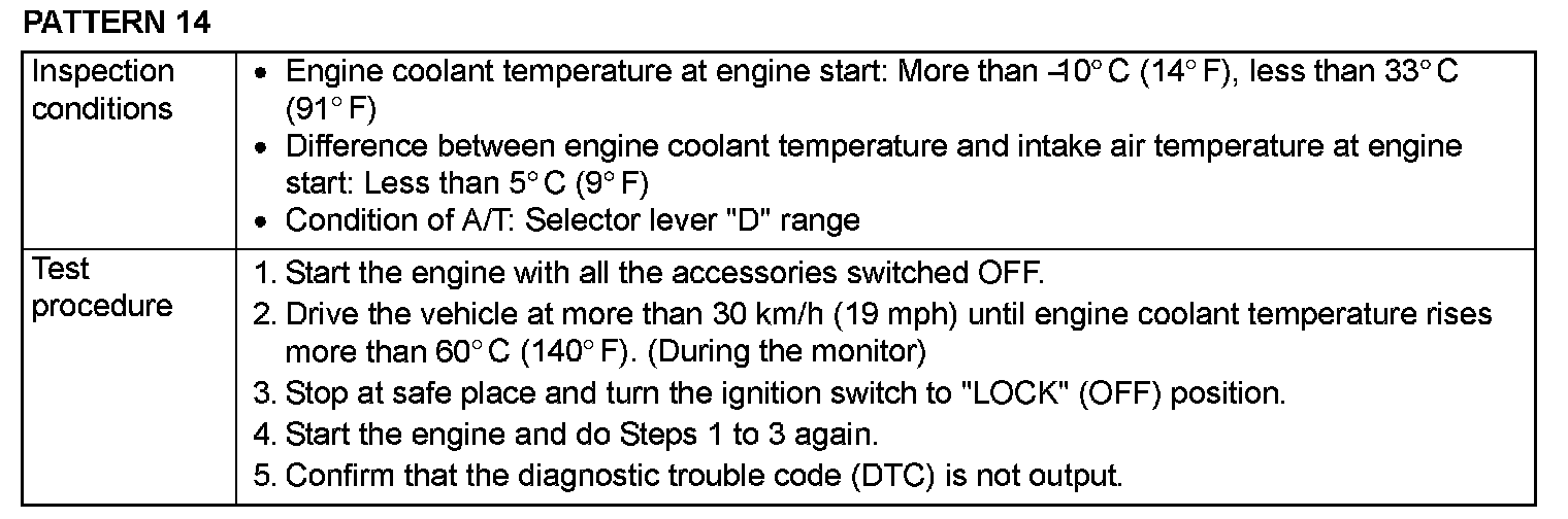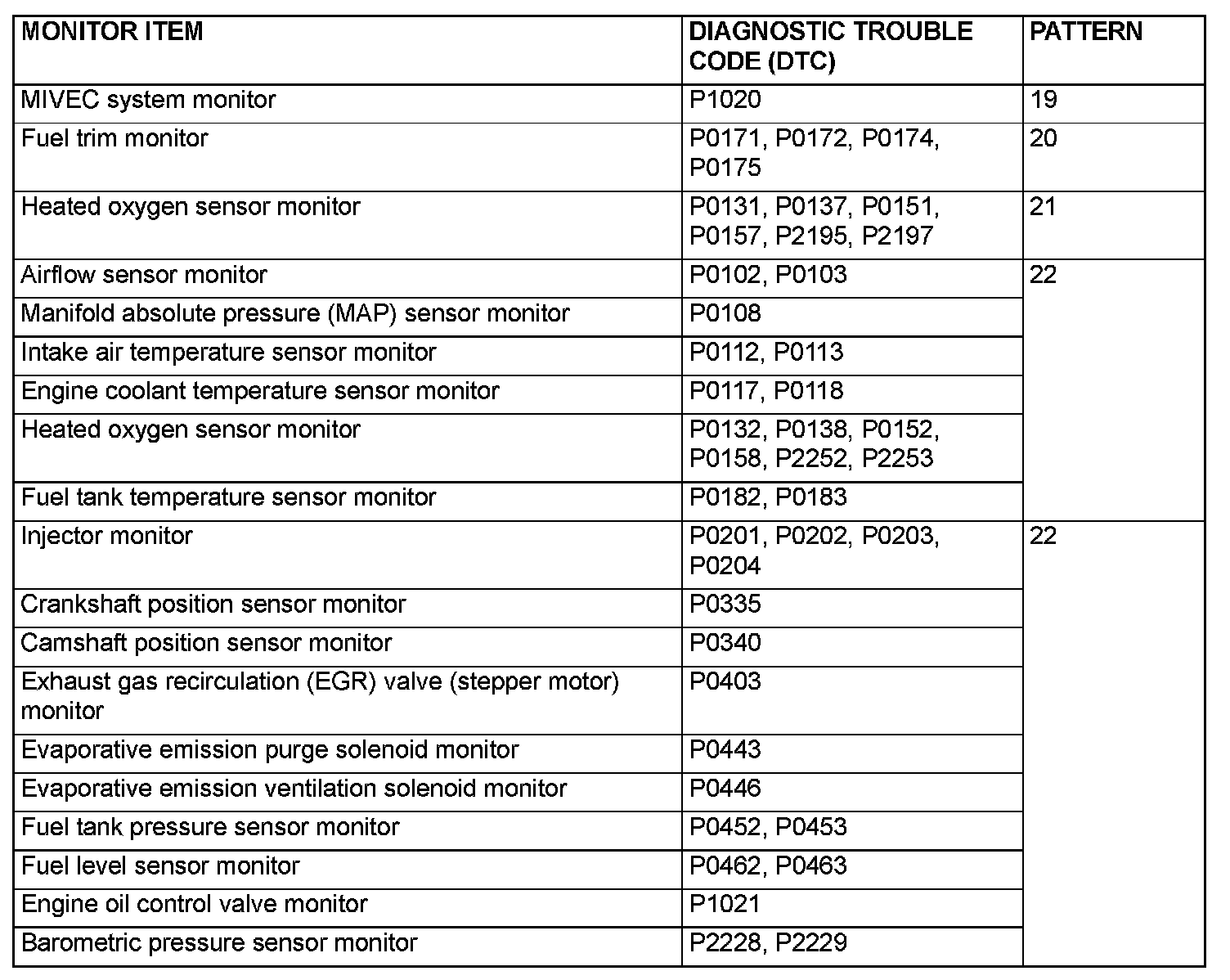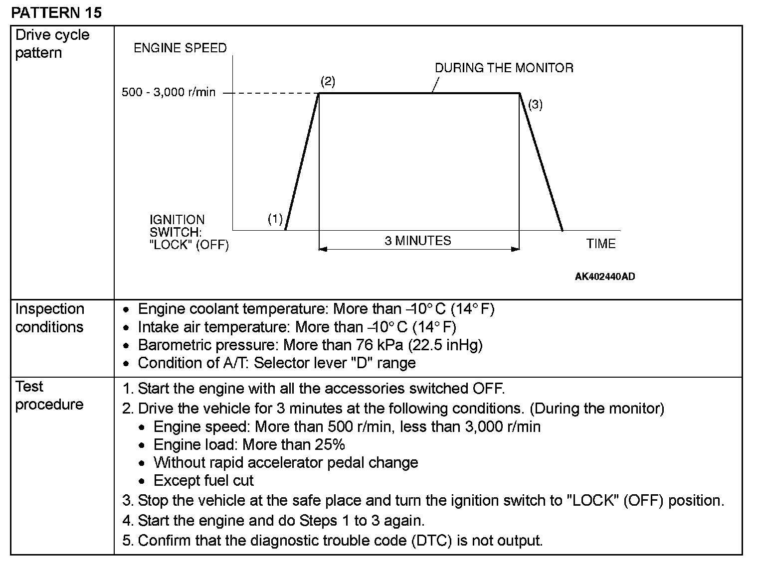 NOTE: Drive cycle patterns are not established for Vehicle speed sensor monitor (DTC P0500), Power steering pressure switch monitor (P0551), and Fuel level sensor monitor (DTC P0461, P2066). Please reference the M.U.T. data list to judge whether these monitor items are normal.