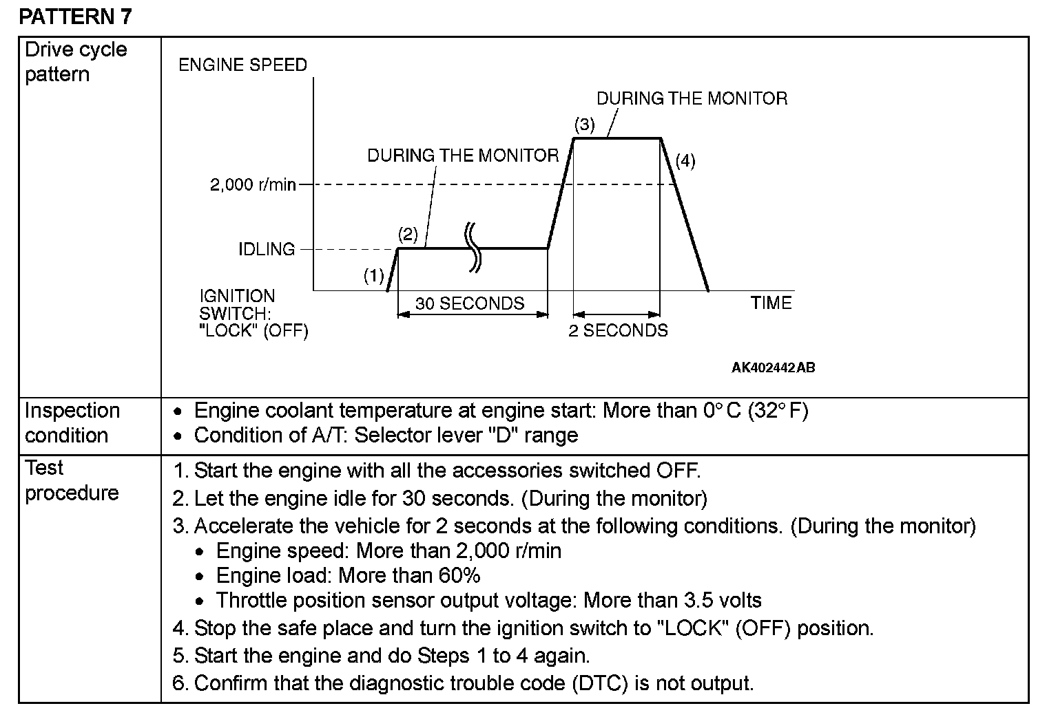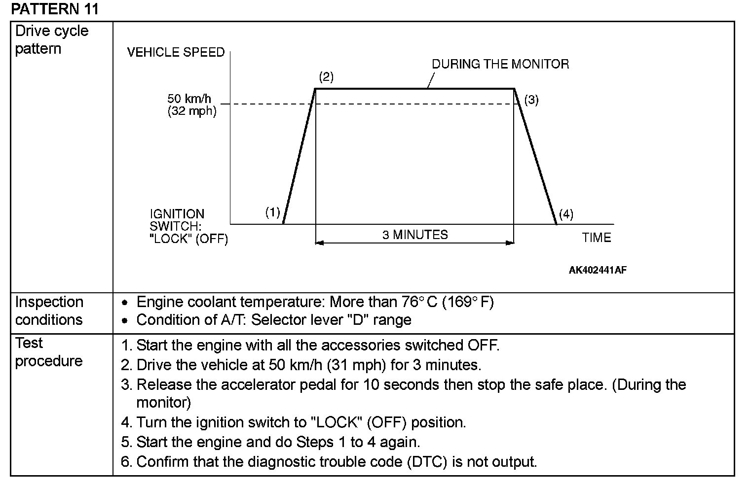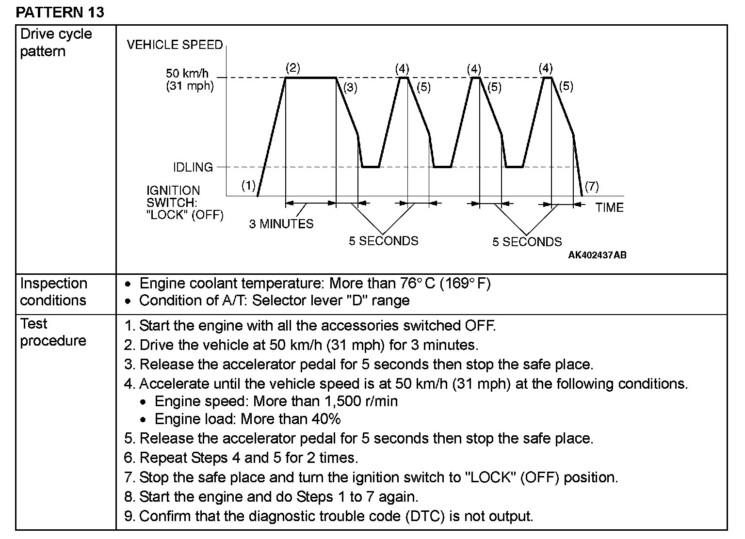 OBD- II DRIVE CYCLEAll kinds of diagnostic trouble codes (DTCs) can be monitored by carrying out a short drive according to the following 22 drive cycle patterns. In other words, doing such a drive regenerates any kind of trouble which involves illuminating the Malfunction Indicator Lamp (SERVICE ENGINE SOON or Check Engine Lamp) and verifies the repair procedure has eliminated [the trouble the Malfunction Indicator Lamp (SERVICE ENGINE SOON or Check Engine Lamp) is no longer illuminated].