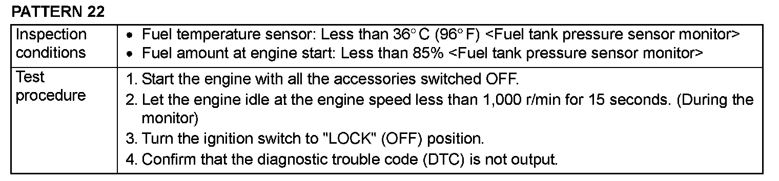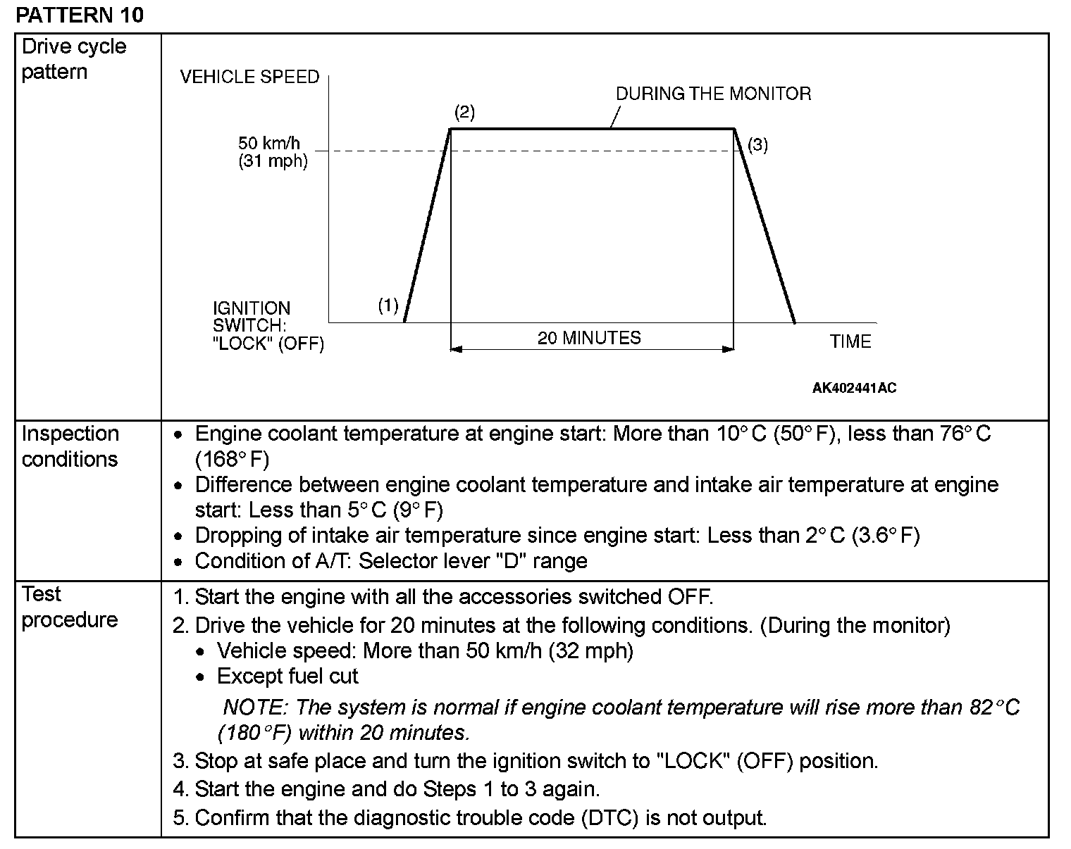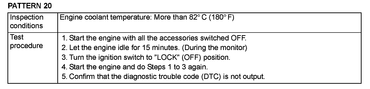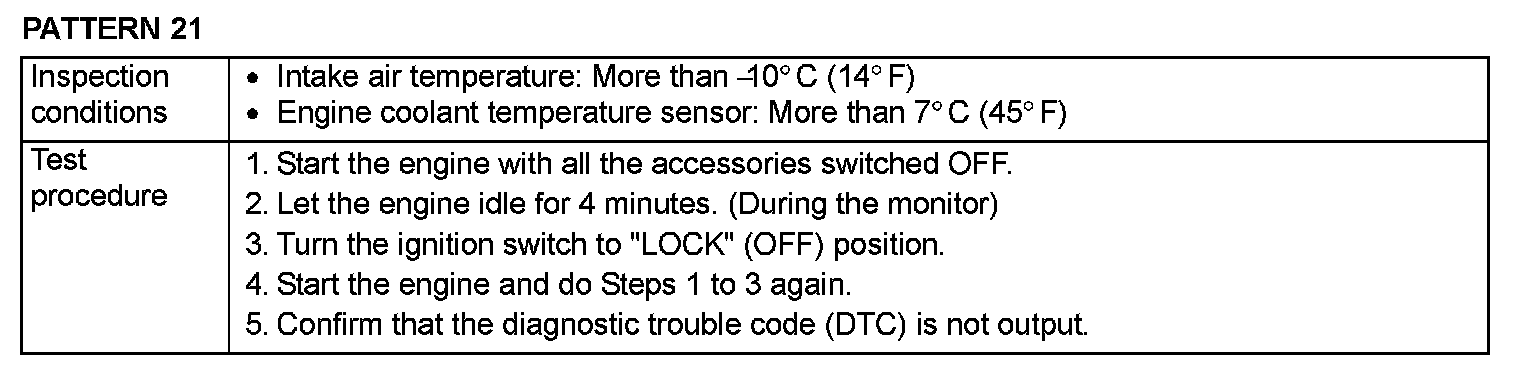 OBD- II DRIVE CYCLEAll kinds of diagnostic trouble codes (DTCs) can be monitored by carrying out a short drive according to the following 22 drive cycle patterns. In other words, doing such a drive regenerates any kind of trouble which involves illuminating the Malfunction Indicator Lamp (SERVICE ENGINE SOON or Check Engine Lamp) and verifies the repair procedure has eliminated [the trouble the Malfunction Indicator Lamp (SERVICE ENGINE SOON or Check Engine Lamp) is no longer illuminated].