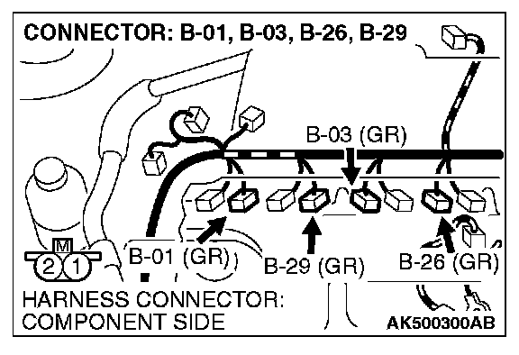 STEP 6. Check harness connector B-01 or B-03 or B-26 or B-29 at injector for damage.