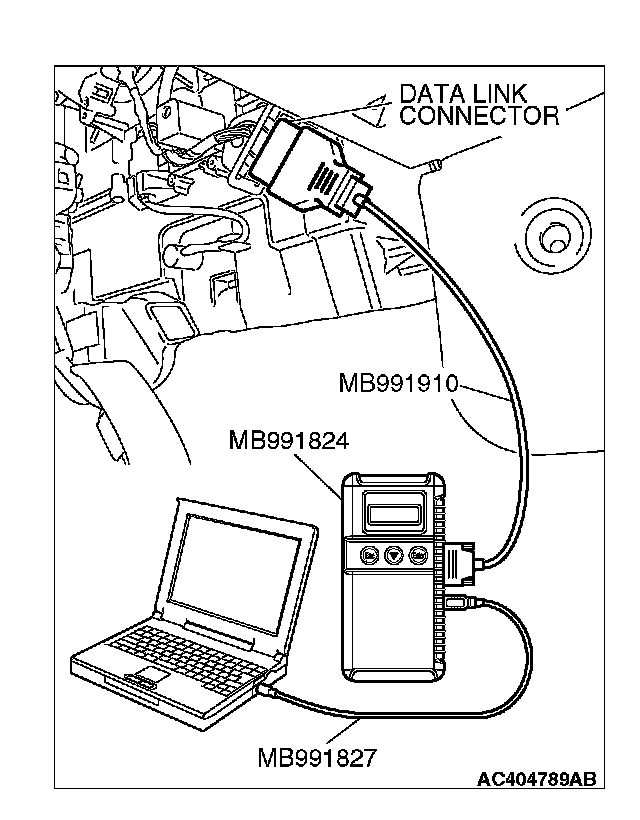 NOTE: Disconnecting scan tool MB991958 is the reverse of the connecting sequence, making sure that the ignition switch is at the "LOCK" (OFF) position.