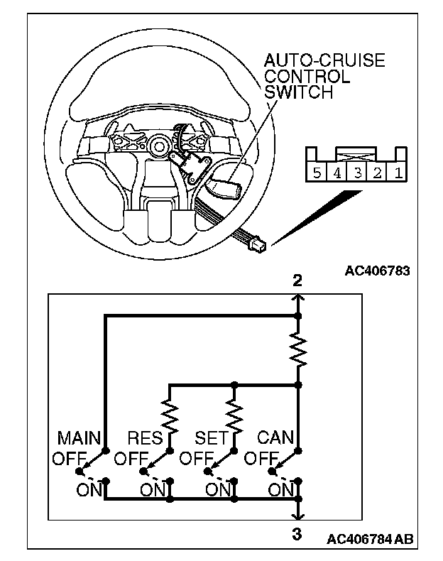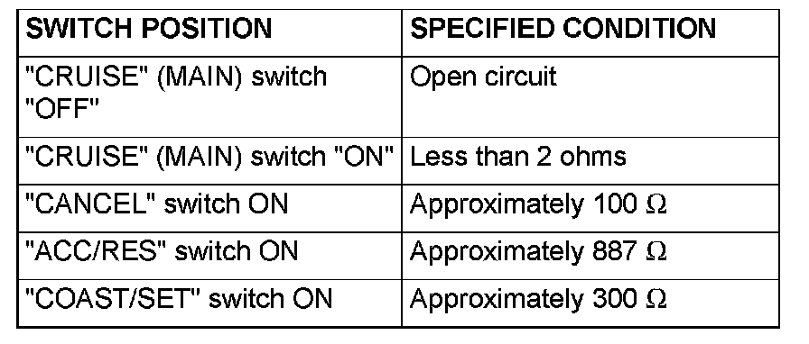2. Measure the resistance between terminal 2 and terminal 3 when each of the "COAST/SET", "ACC/RES", "CANCEL" and "CRUISE" (MAIN) switches is pressed. If values measured at the time each switch is pressed correspond to those in the table below, the resistance values are correct.