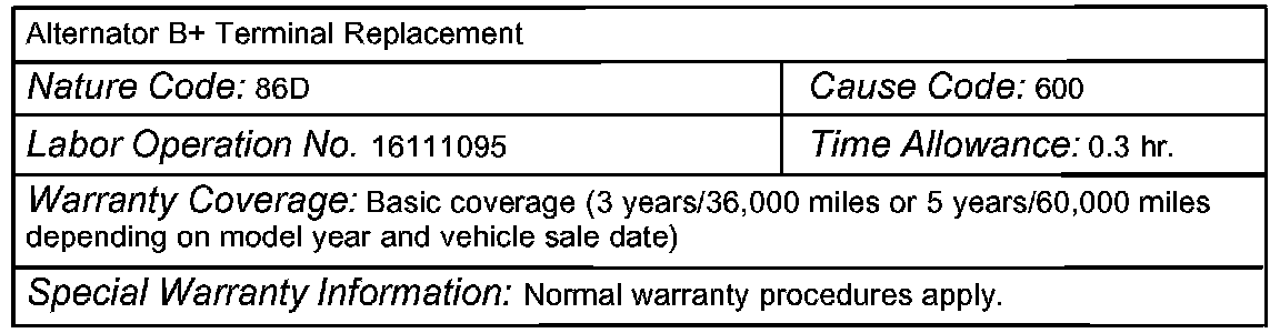 Do not replace the alternator because of a damaged B+ terminal resulting from a loose nut. Alternator B+ terminal replacement parts are now available (listed in the PARTS INFORMATION section below).