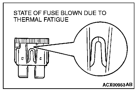 When a fuse is blown, there are two probable causes. One is that it is blown due to flow of current exceeding its rating. The other is that it is blown due to repeated on/off current flowing through it. Which of the two causes is responsible can be easily determined by visual check as described below.