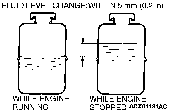 4. Check the fluid in the oil reservoir for foaming or milkiness. Check the difference of the fluid level when the engine is stopped, and while it is running. If the fluid contains air or has milky appearance, or the fluid level fluctuate by 5 mm (0.2 inch) or more, power steering system air bleeding should be done.