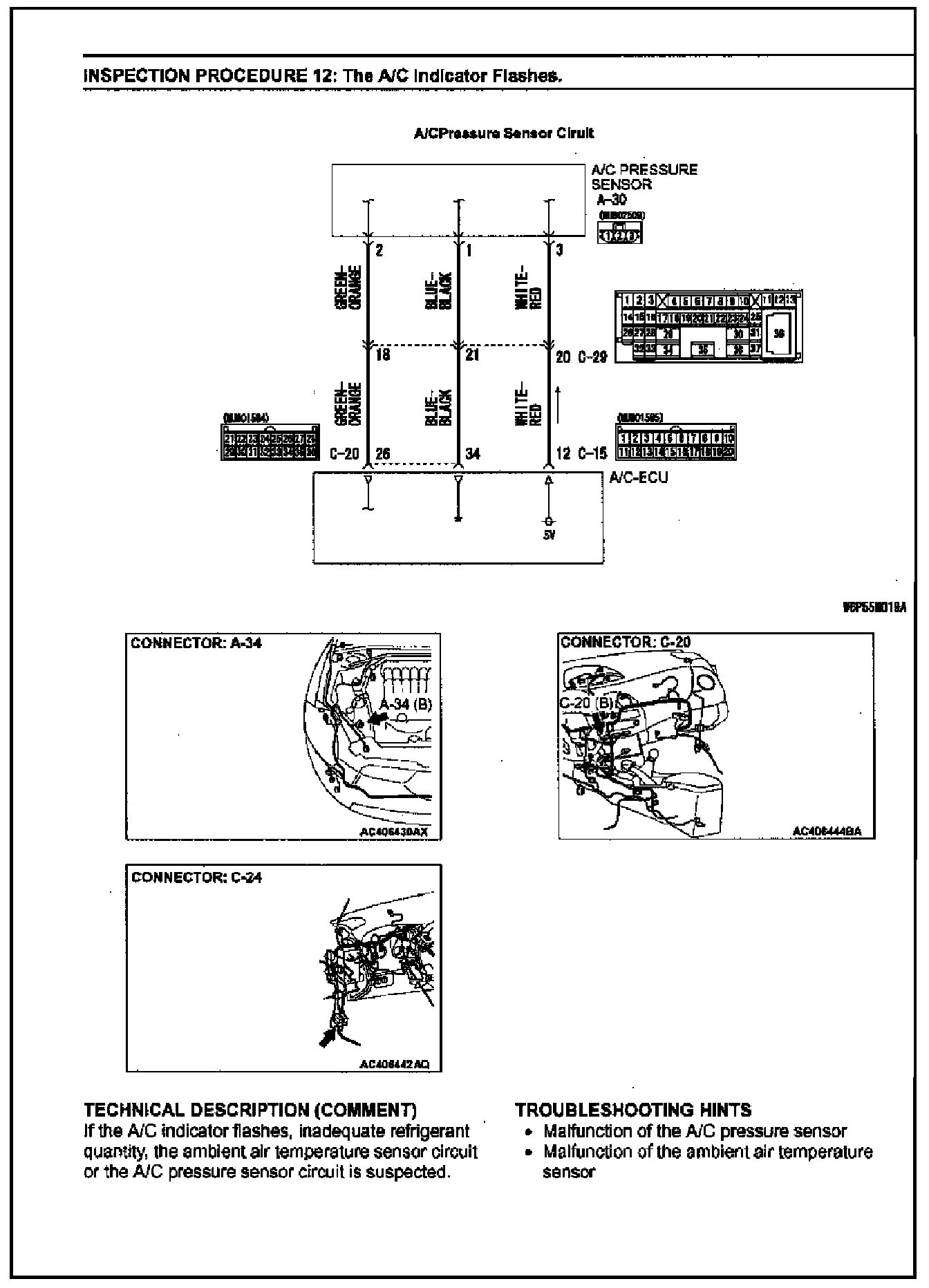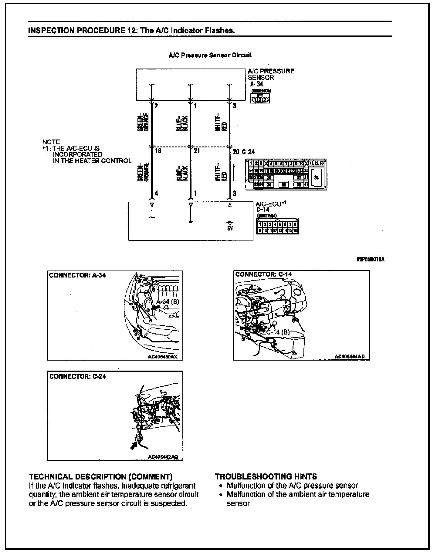 Diagnosis procedures for a flashing A/C indicator light are missing in the affected service manuals. This bulletin contains these diagnosis procedures (Inspection Procedure 12) for manual and automatic A/C systems.