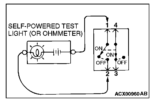 1. When the switch is in the "OFF" position and the contact points of terminals 1 and 2 are connected, the self-powered test light should illuminate or the ohmmeter should read 0 ohms.